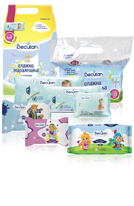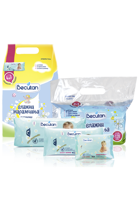 Becutan влажните марамчиња содржат хидратантен лосион со екстракт од камилица кој ја штити кожата од појава на иритации, го смирува црвенилото и го оневозможува неговото понатамошно ширење. На површината на кожата оставаат тенок заштитен слој кој ја негува и ја одржува кожата чиста и здрава. Имаат неутрална pH вредност и не содржат алкохол. Becutan влажните марамчиња покрај намената за нега на кожата во деловите покриени со пелена, се препорачуваат и за чистење на лицето и рачињата на бебето.
